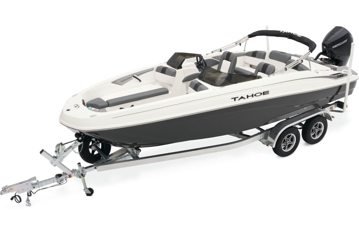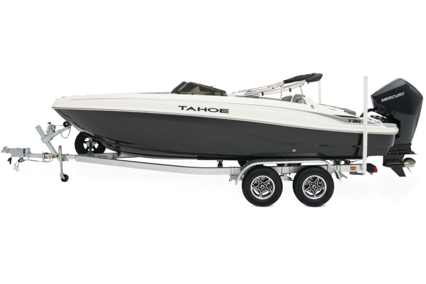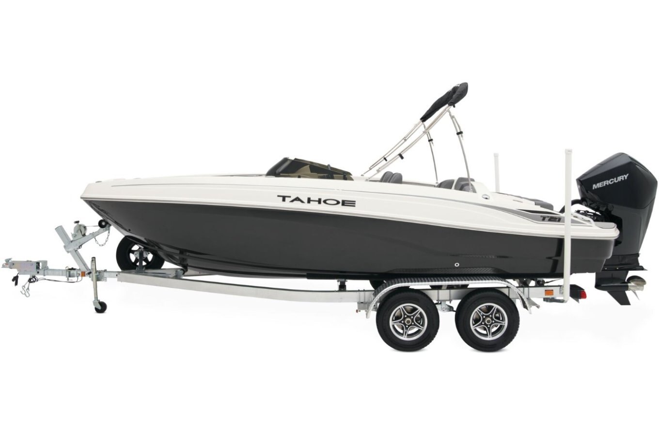 The 2026 TAHOE® T21 comes standard with a 150hp Mercury® XL Pro XS® FourStroke outboard motor and has a recommended maximum 200hp rating. This model is packaged with a trailer.