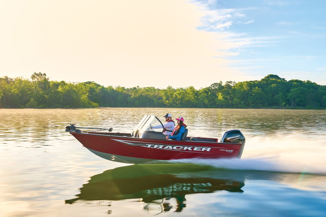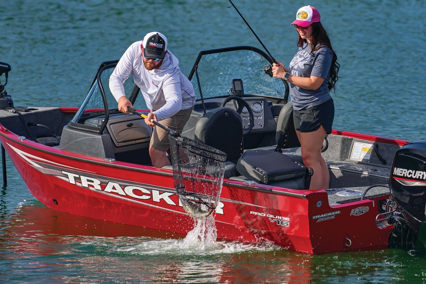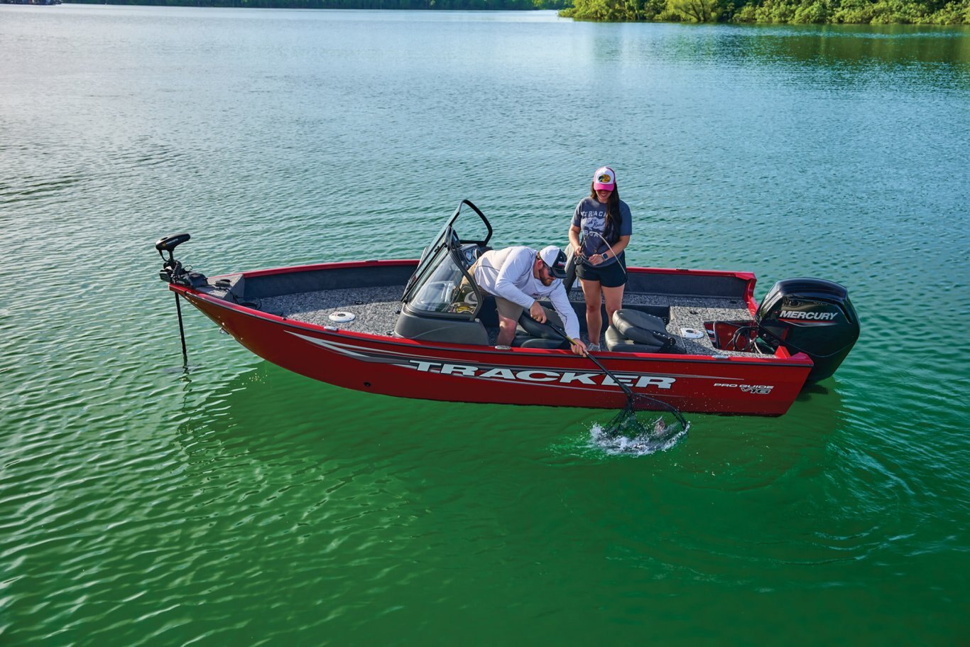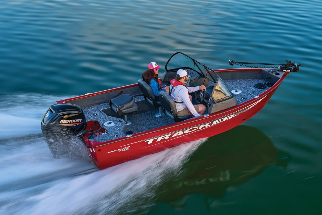 The TRACKER PRO GUIDE V-16 WT packs a punch in a compact, Deep V hull design. The walk-thru windshield shields you from the elements, ensuring comfort in all conditions. With three fishing seats and six customizable setups, the PRO GUIDE V-16 WT is ready for your whole crew. The Deep V hull is sdesigned for smooth, dry performance and peak edge-to-edge stability. It has space galore, so you can haul all your gear with ease. Up front is a standard Minn Kota trolling motor with a livewell/baitwell and twin storage boxes while the console features a Garmin Striker 4 color fishfinder with a full gauge setup and smooth, reliable steering. Rounding out the package are a custom-fitted trailer and reliable, economical four stroke Mercury power. |