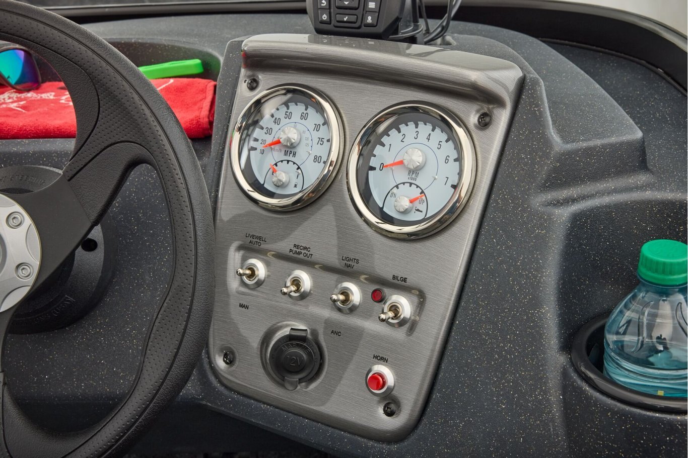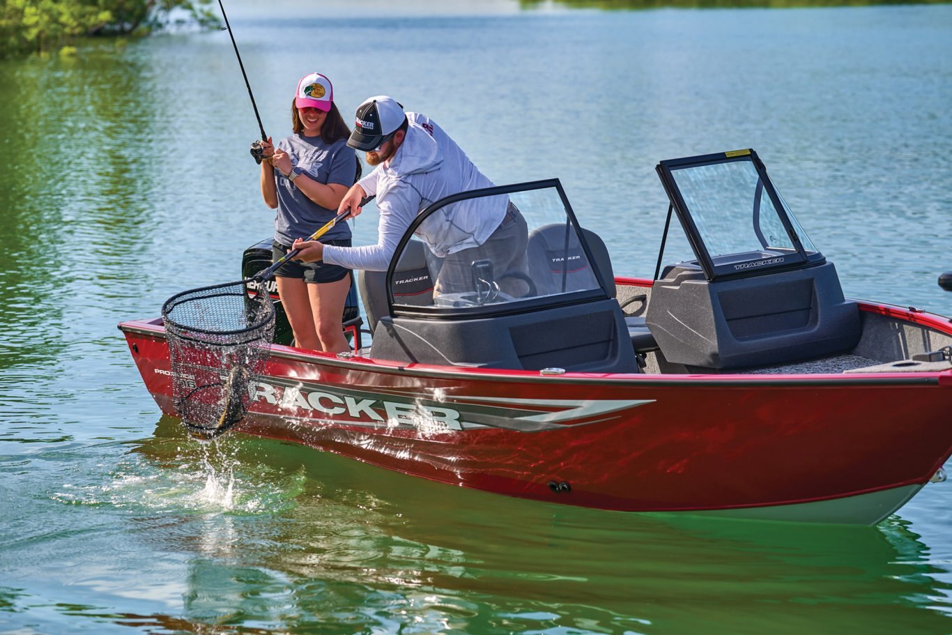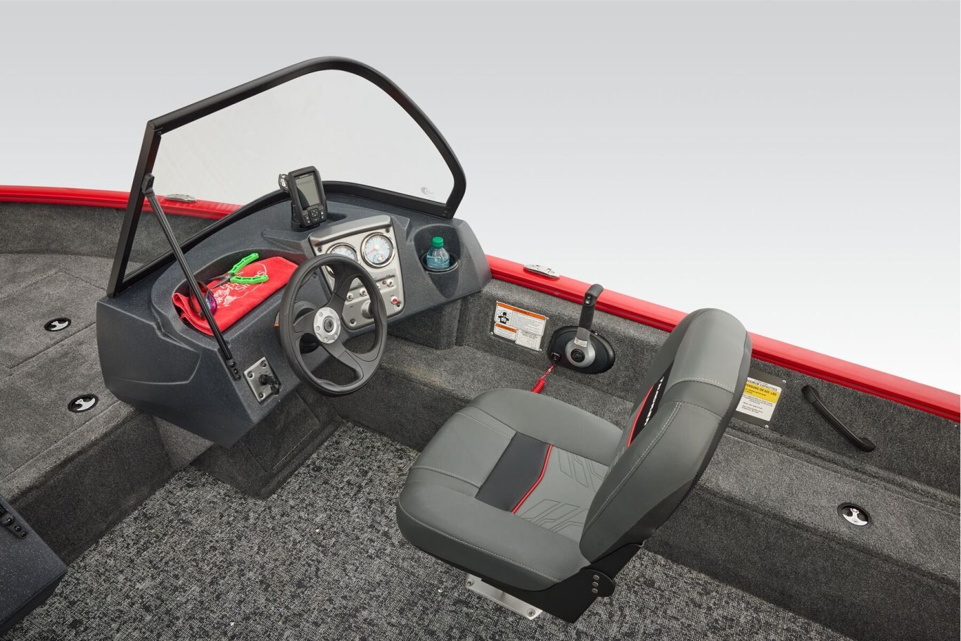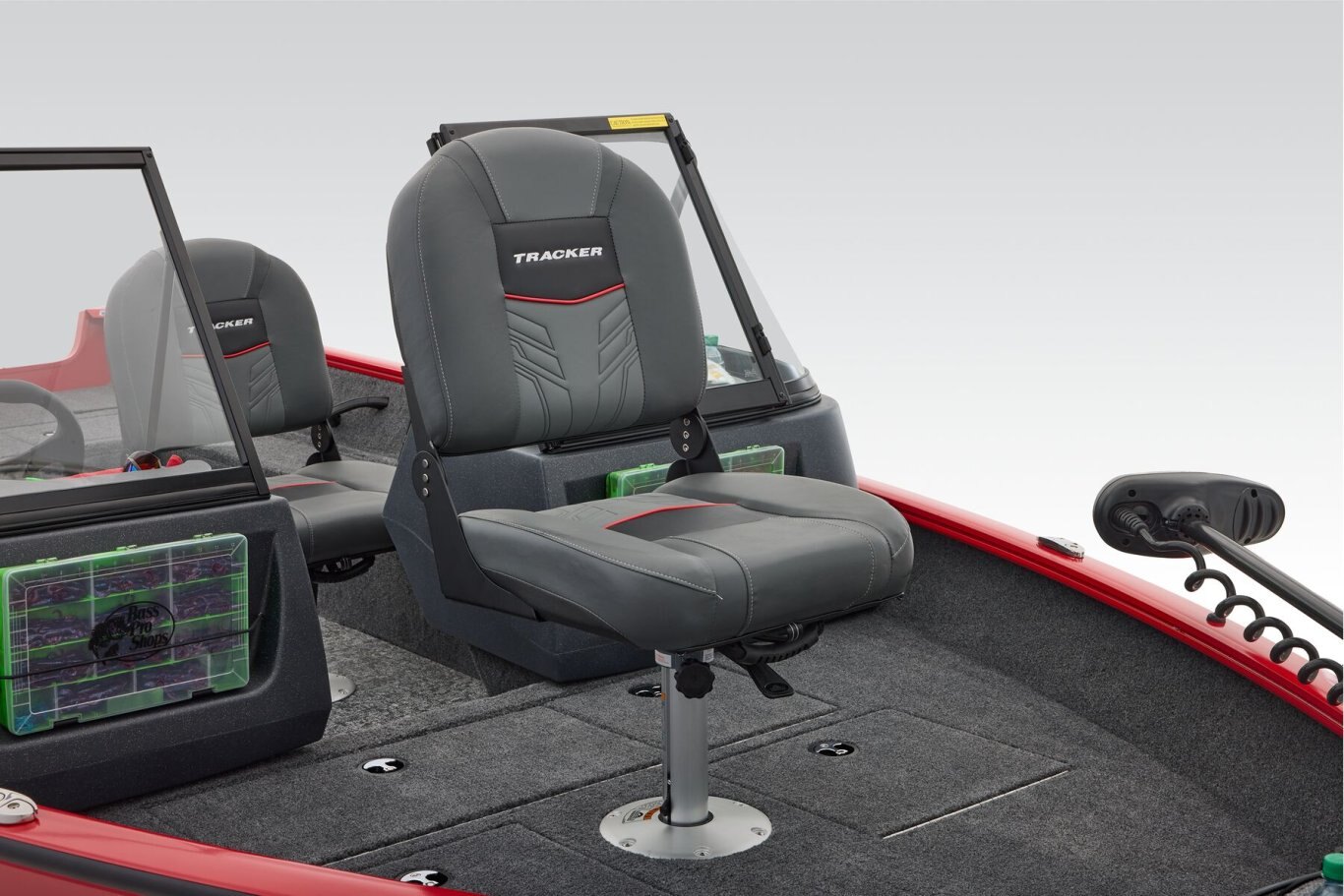The TRACKER PRO GUIDE V-16 WT packs a punch in a compact, Deep V hull design. The walk-thru windshield shields you from the elements, ensuring comfort in all conditions. With three fishing seats and six customizable setups, the PRO GUIDE V-16 WT is ready for your whole crew. The Deep V hull is sdesigned for smooth, dry performance and peak edge-to-edge stability. It has space galore, so you can haul all your gear with ease. Up front is a standard Minn Kota trolling motor with a livewell/baitwell and twin storage boxes while the console features a Garmin Striker 4 color fishfinder with a full gauge setup and smooth, reliable steering. Rounding out the package are a custom-fitted trailer and reliable, economical four stroke Mercury power. |