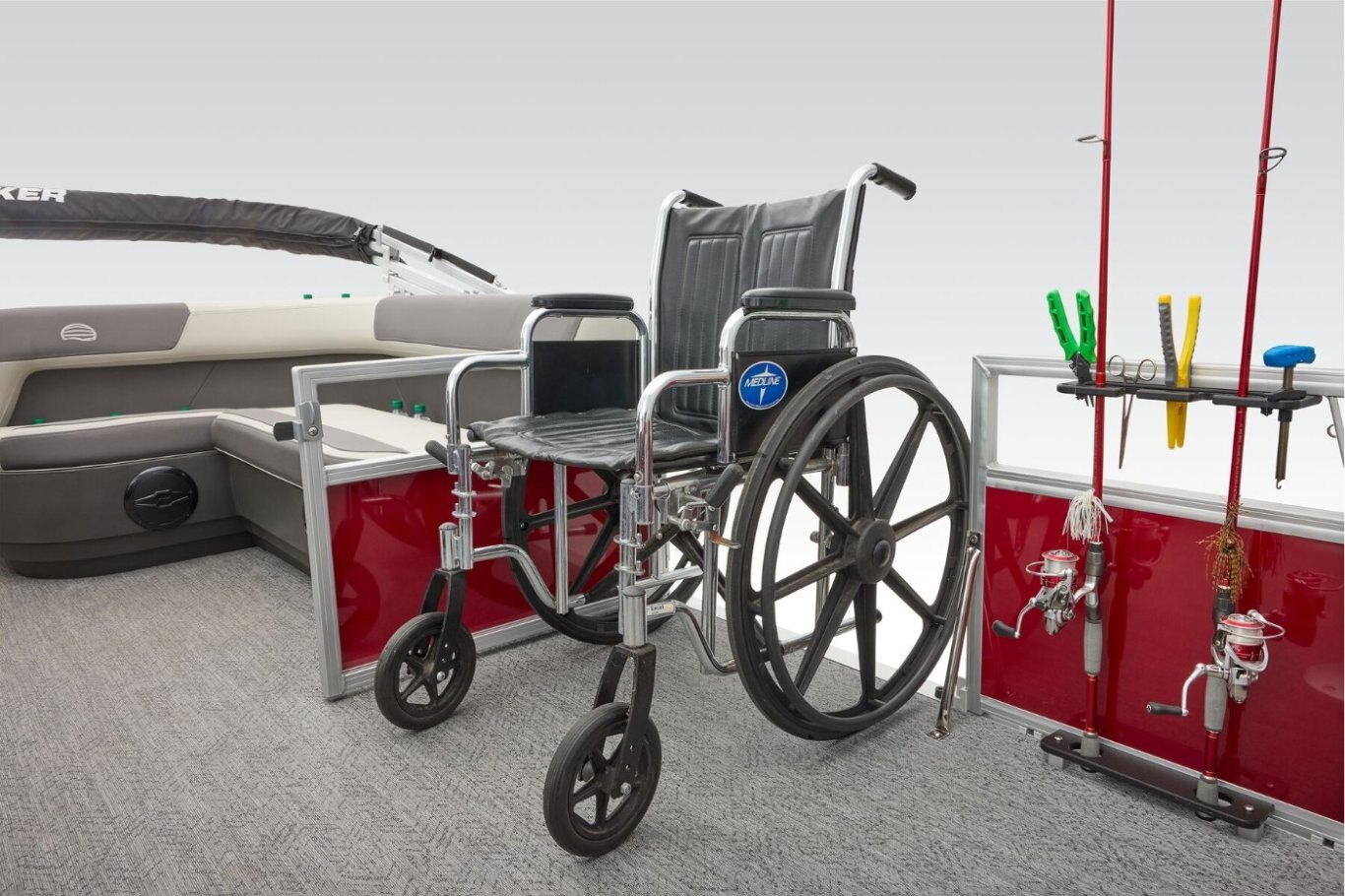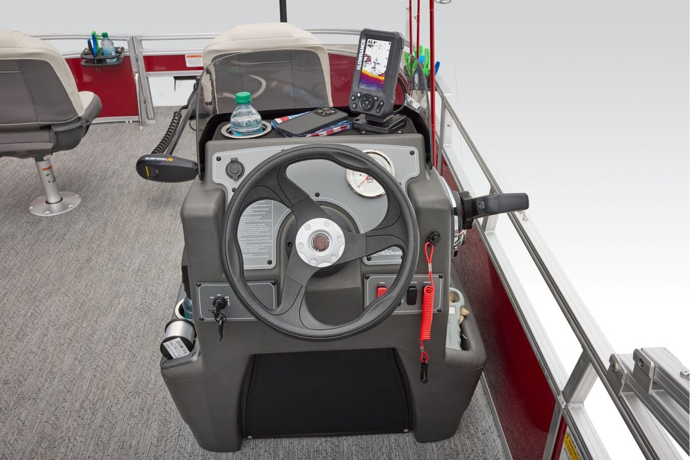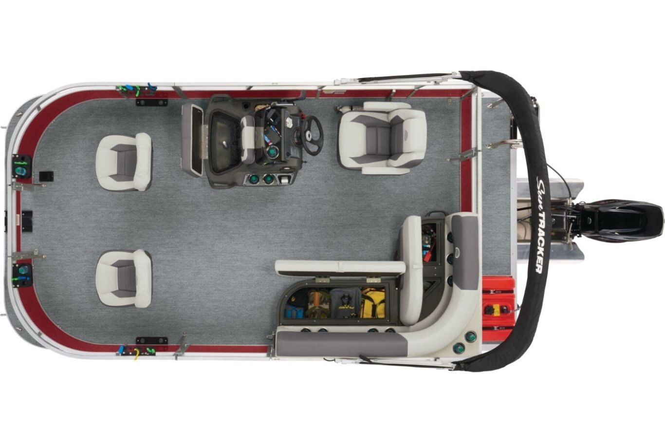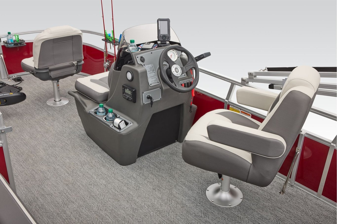This seven-passenger fishing pontoon hits the water with new console and lounge designs. Get three extra cubic feet of storage thanks to clever backrest cut-outs. The redesign also adds a seat in front of the driver console, phone compartments, and four more cupholders. Cast from the shade of a standard 7' bimini top in one of the two folding fishing seats. Find your spot on the lake from the decked-out driver console, which comes with its own rod holder. The original BASS BUGGY was the first fishing pontoon ever made. The 2026 model takes that heritage and runs wild with it. |