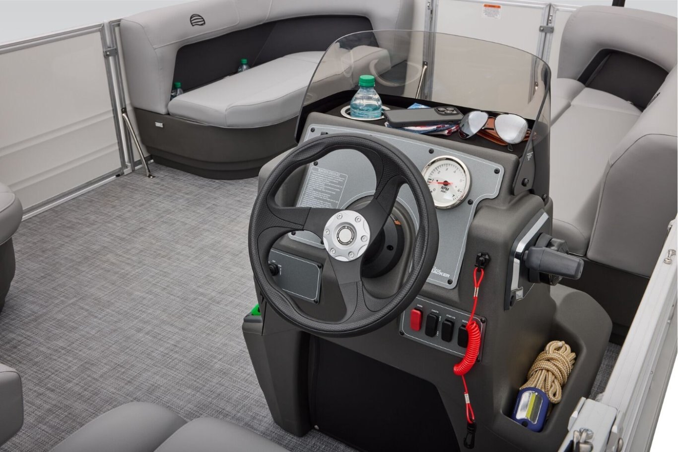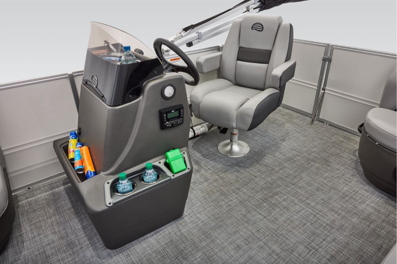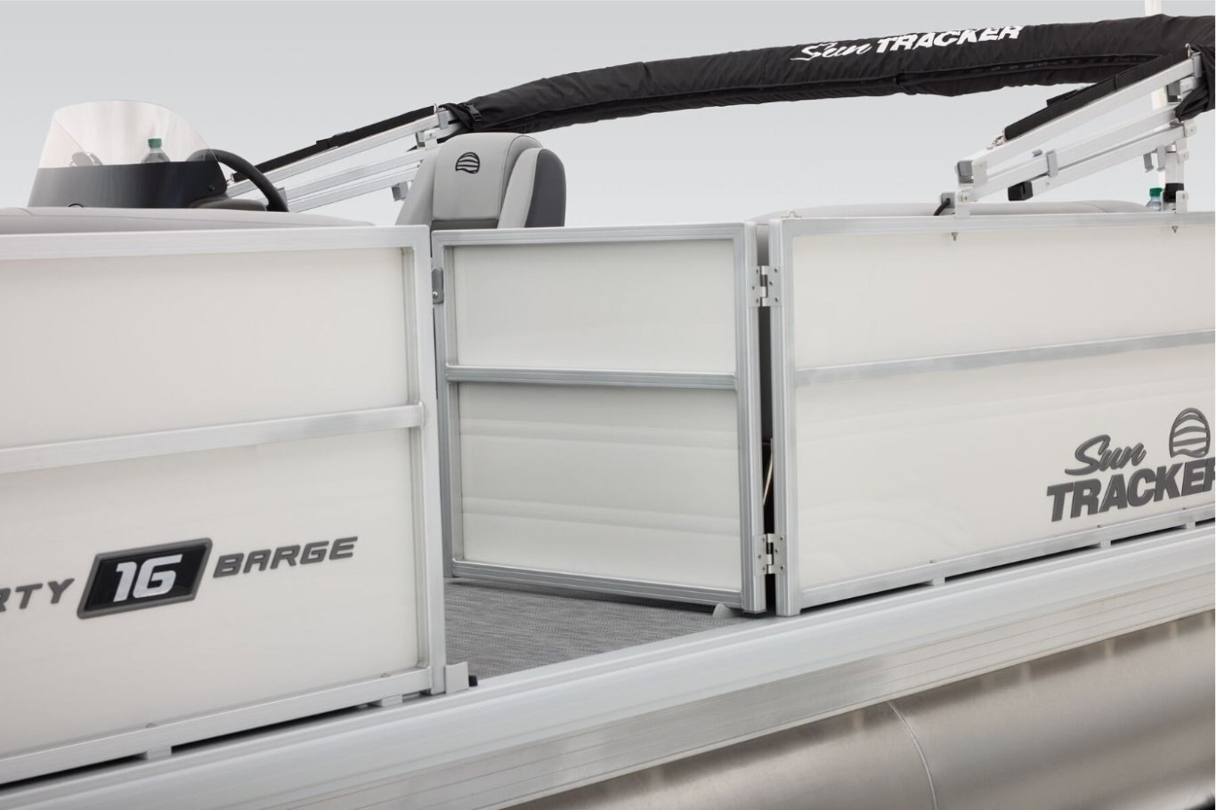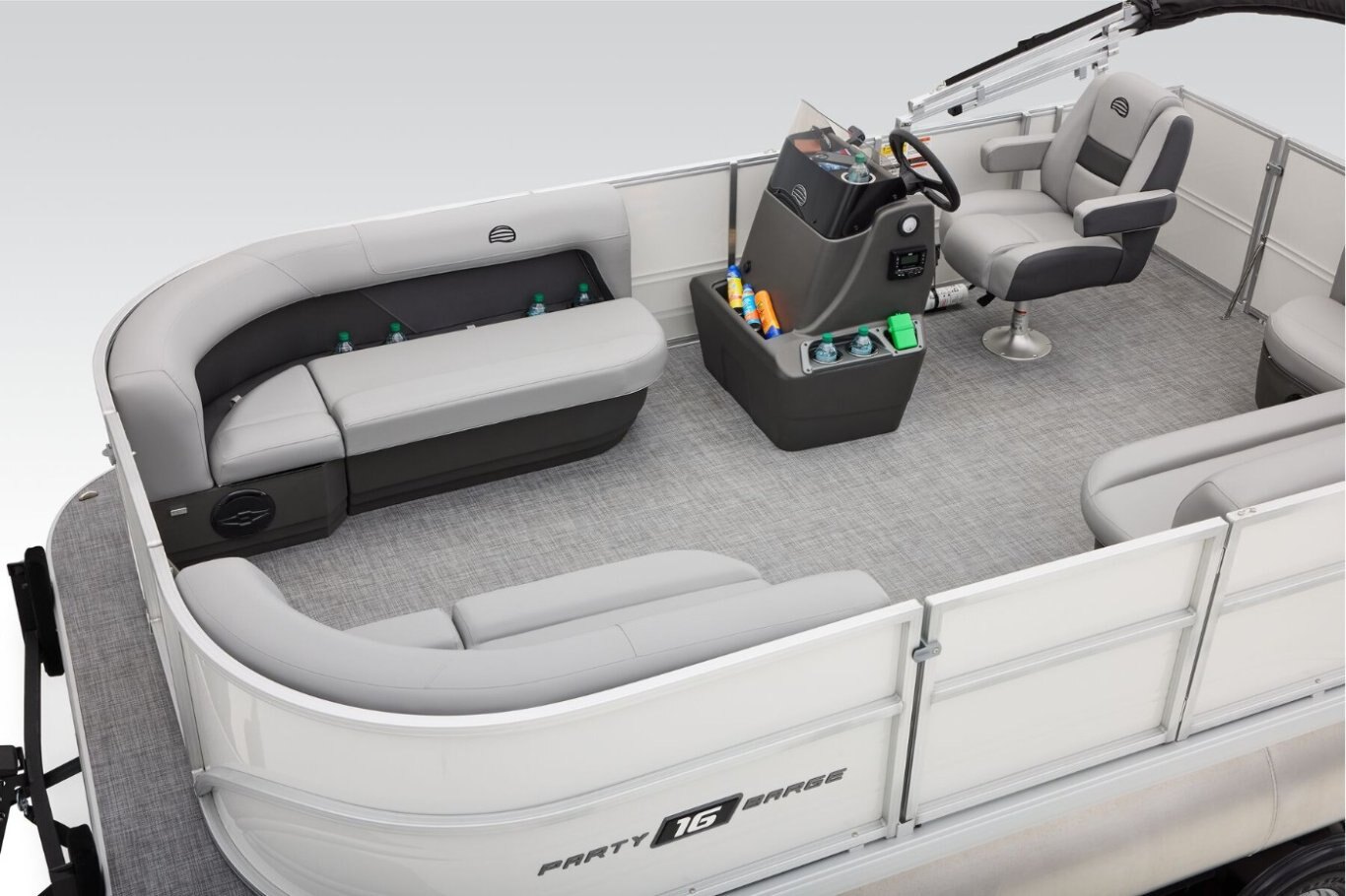 This year's PARTY BARGE gets some slick upgrades. Extra cupholders and storage built into the lounge backrests and improved handles make keeping your supplies at hand easier than ever. A new driver console design creates extra style. The boarding ladder has wider, more ergonomic steps. Crank up the soundtrack of the summer with the standard Bluetooth®-capable Wet Sounds™ stereo and pull up the 7' bimini top to party in the shade when the sun is high. Find your corner of the lake and relax in one of the three corner lounges. Memories come easy in boats like the PARTY BARGE 16 DLX. Start making yours this summer! |