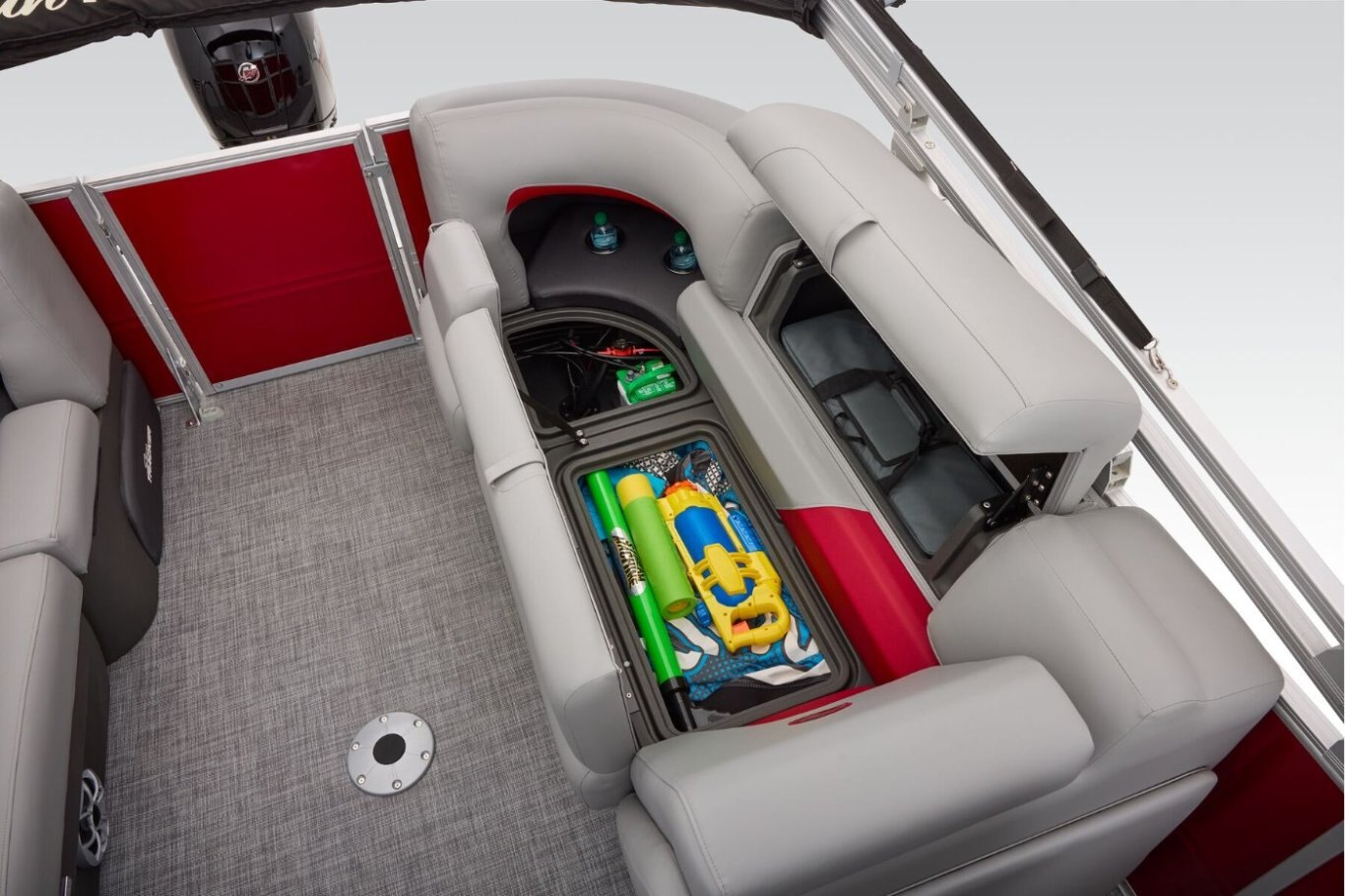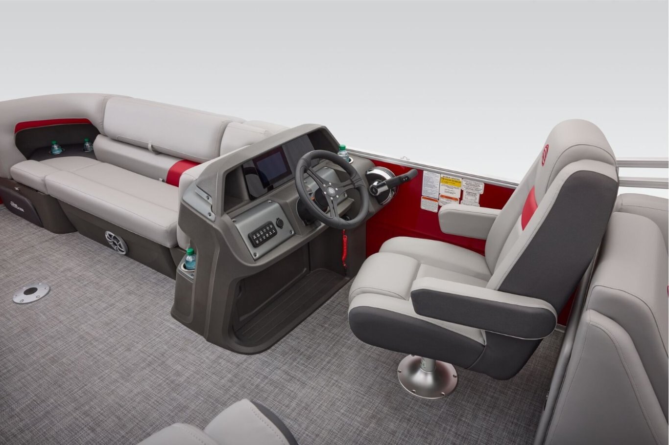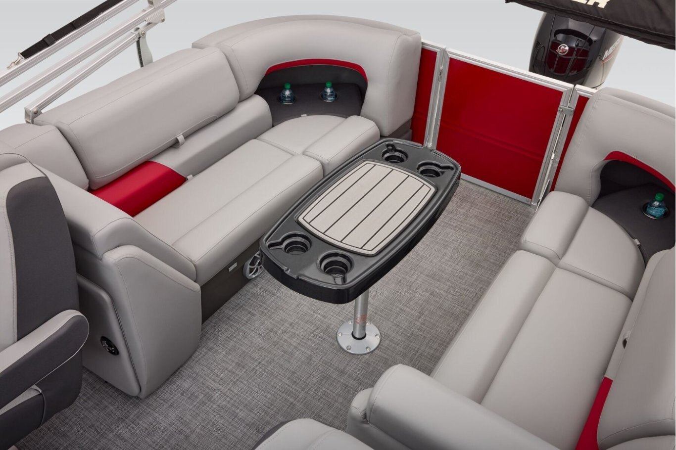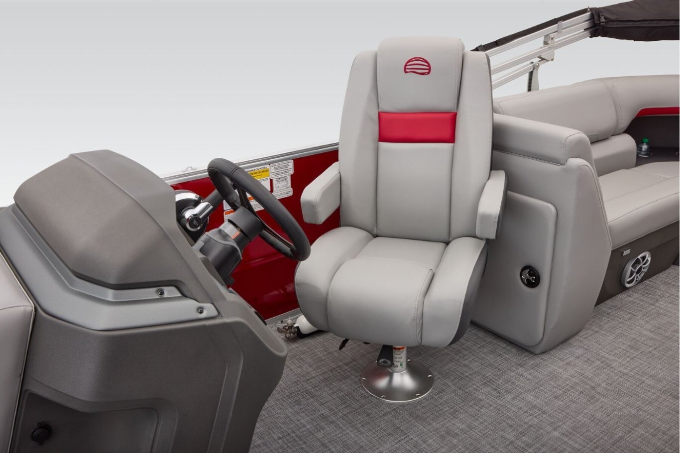 The 22 DLX gets an all-new interior loaded with comfortable seating for the 2026 model year. The four wraparound lounges have bright new accents that match the fence color and now feature cut-out sections in the backrest that offer more storage space and cupholders. Stow supplies under the seats and in the seat-back STOW MORE™ hidden compartments. The captain's console has also received a full redesign with upgraded tech. Even the flooring has been upgraded with a sophisticated and clean weave. Also new for 2026 is a wider, more ergonomic four-step boarding ladder that makes getting back into the boat easier. From the expansive deck to the punched-up motor, this pontoon has what you need to take on the summer. It's time to jump into the pontoon world! |