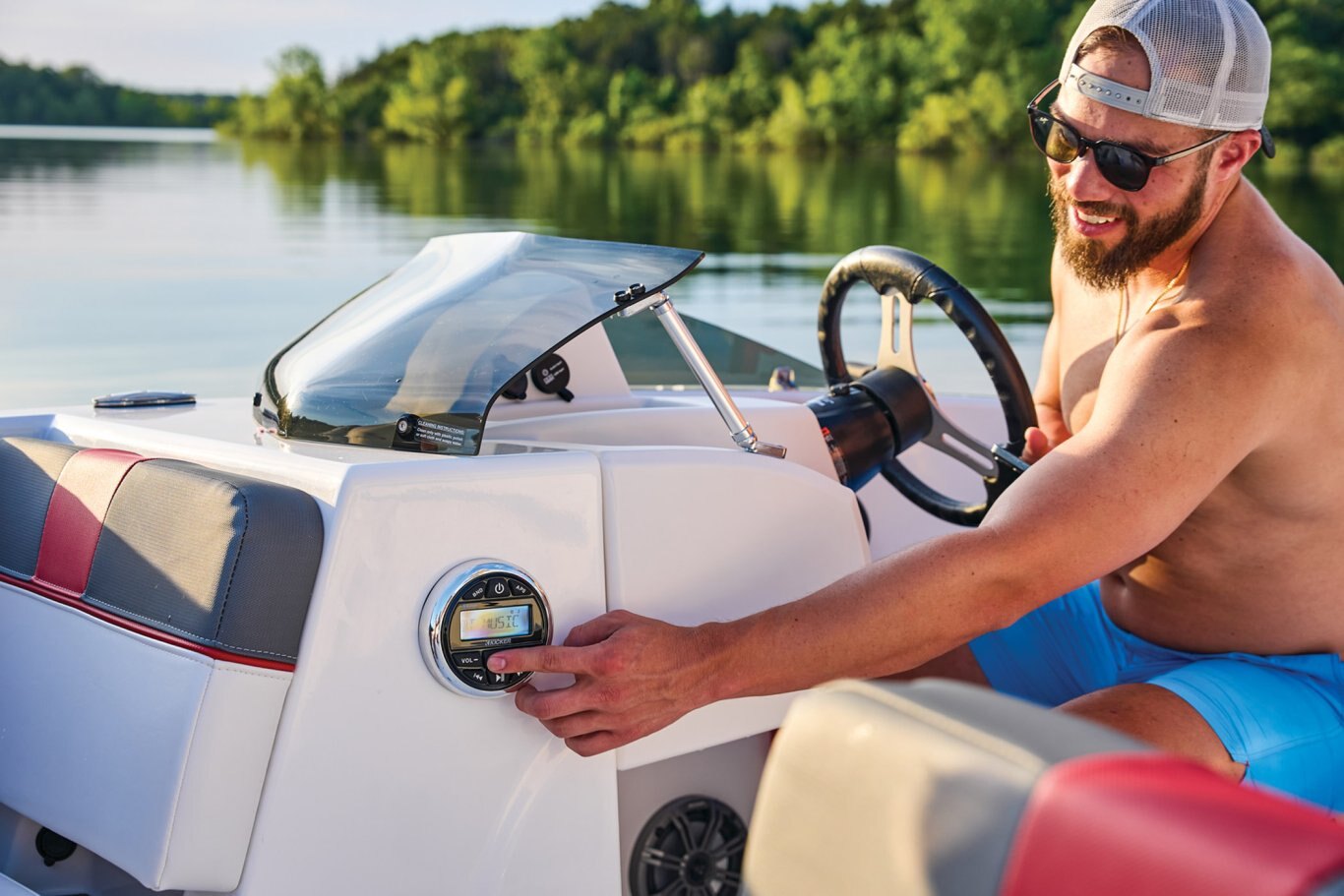 This 9-passenger midsize runabout boat is built for performance, complete with a POWERGLIDE® hull with HYDROSTEP strakes. The pilot's console features a 7" touch screen that delivers information such as motor vitals, speed, and depth. Play your adventure's soundtrack through the 4-speaker Kicker® stereo as you pull tubes, skiers, and
