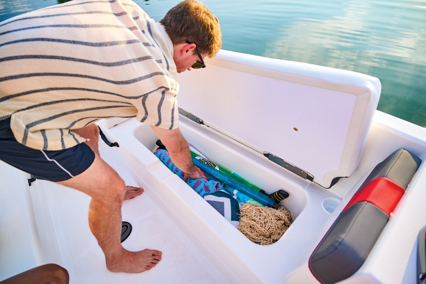 wakeboarders with the optional TurboSwing® ski tow bar. Ample in-floor storage keeps your snacks, towels, and safety equipment secure and out of the way.