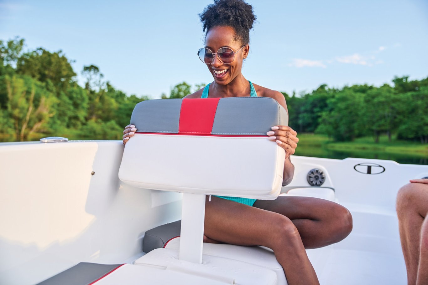 The aft swim platform with a 4-step telescoping boarding ladder makes it easy to jump in and out of the water. Find your favorite seat in the 3-across midship bench, dual forward lounges, or aft sun pad. The port bow backrest can be reversed for forward or aft seating and its cushion can even be flipped up so passengers don't step on the upholstery as they board. Add the optional bimini top to create the perfect lake-day boat your friends and family will love!