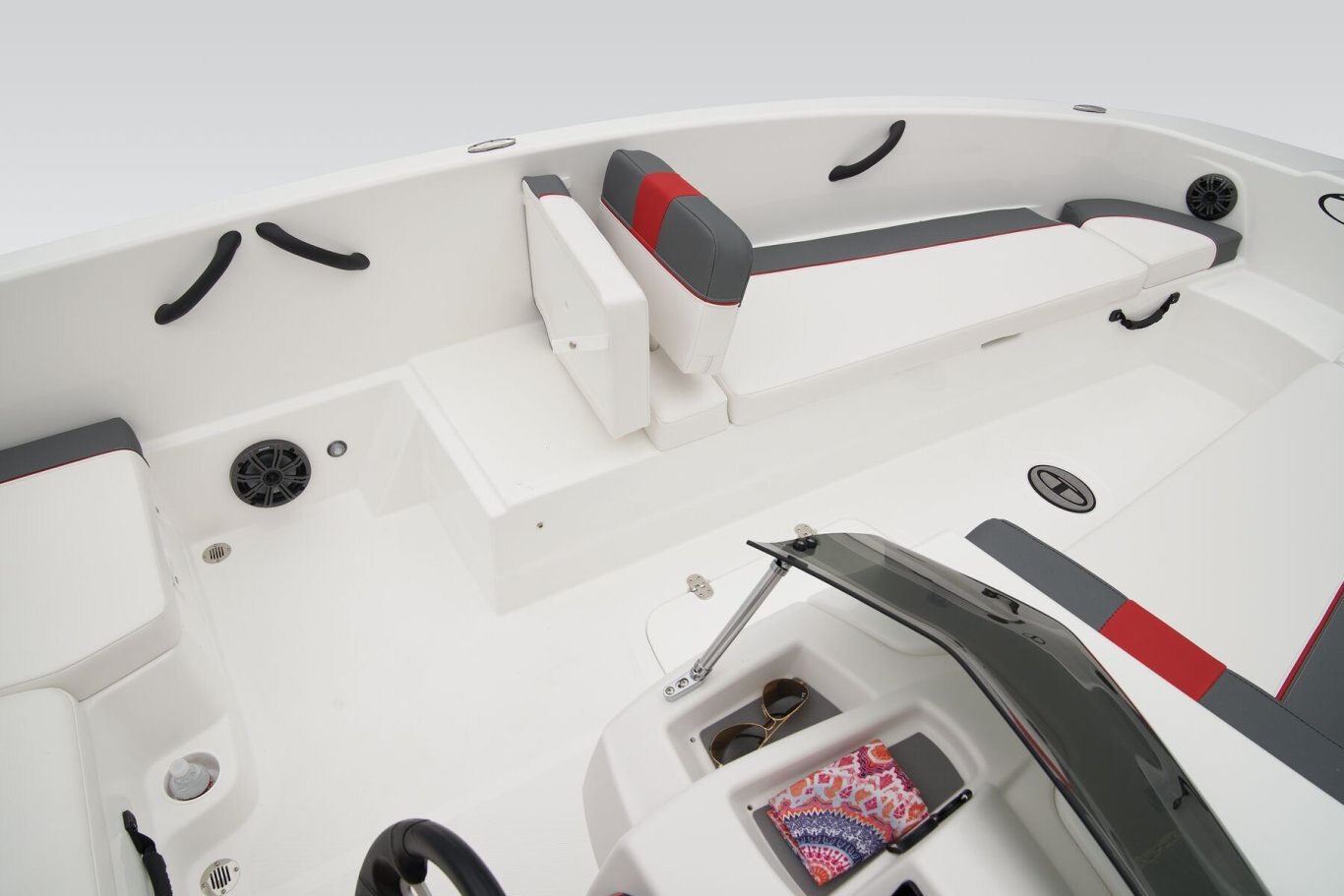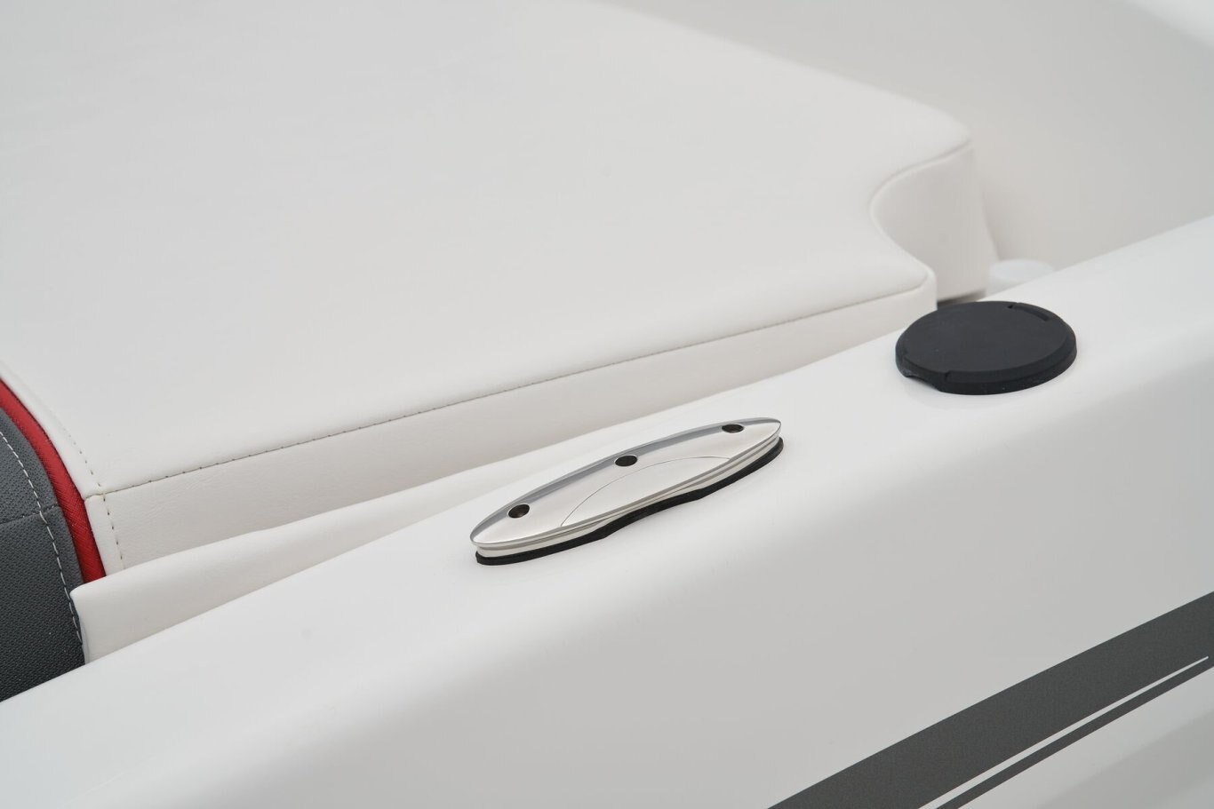 The aft swim platform with a 4-step telescoping boarding ladder makes it easy to jump in and out of the water. Find your favorite seat in the 3-across midship bench, dual forward lounges, or aft sun pad. The port bow backrest can be reversed for forward or aft seating and its cushion can even be flipped up so passengers don't step on the upholstery as they board. Add the optional bimini top to create the perfect lake-day boat your friends and family will love!