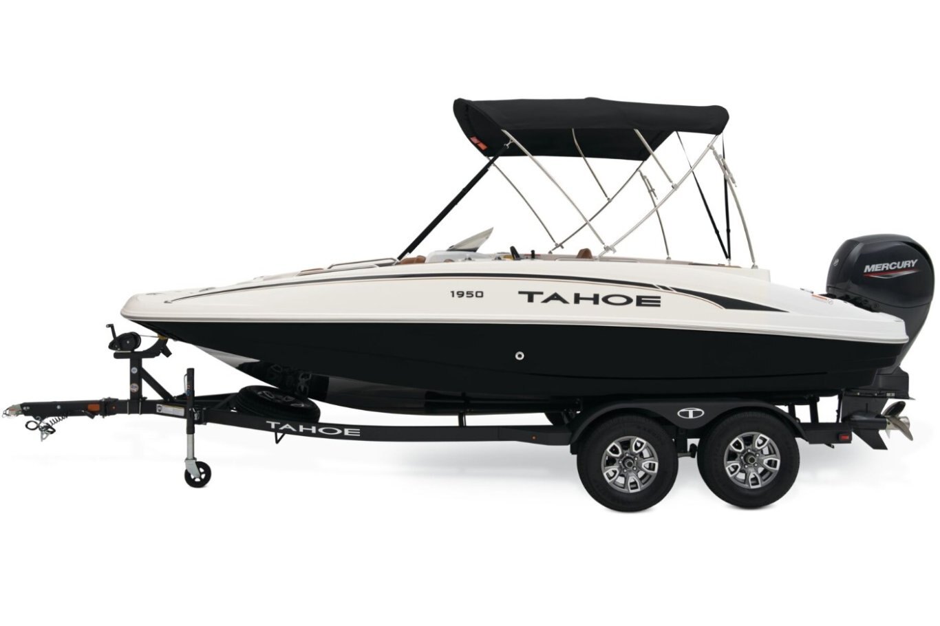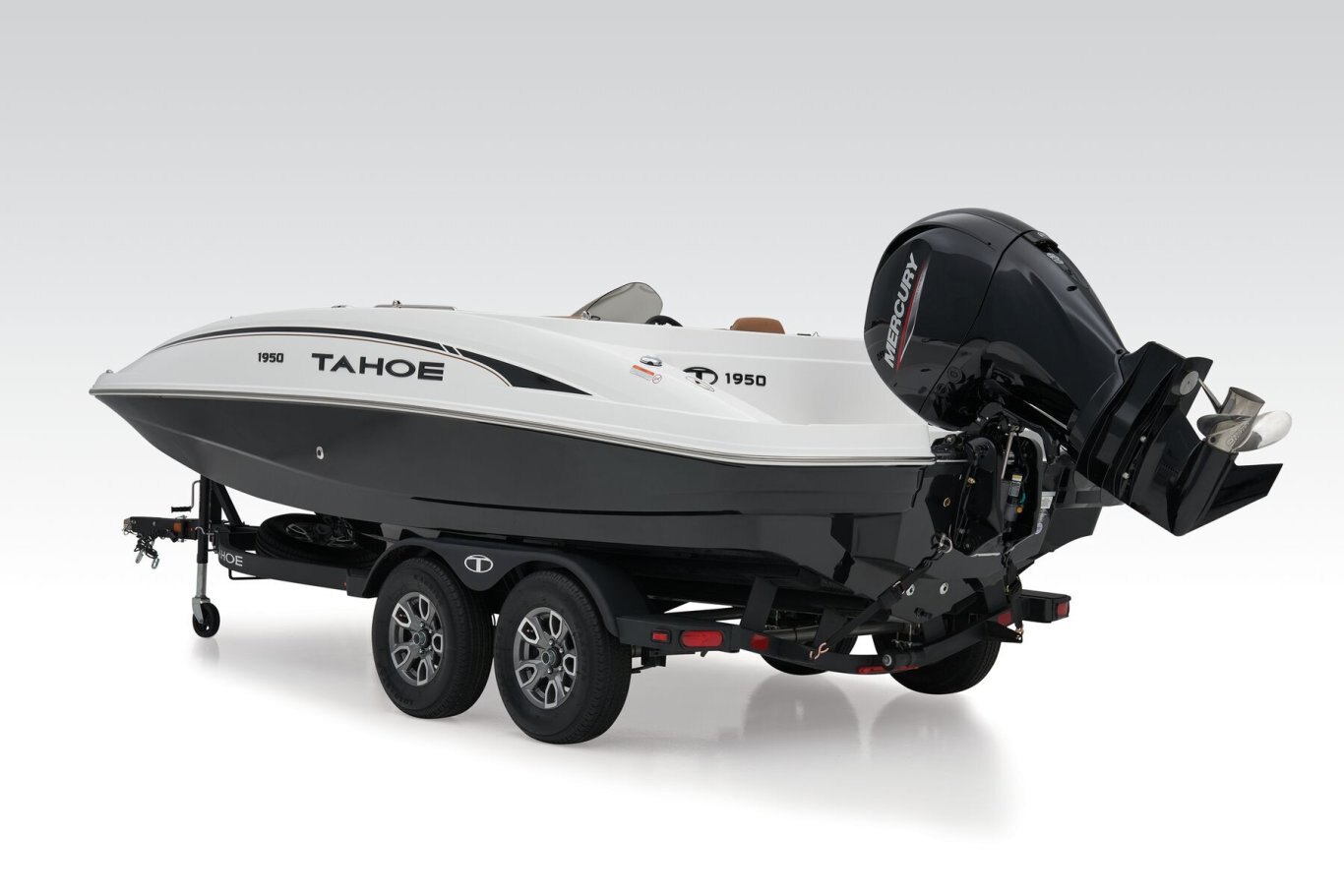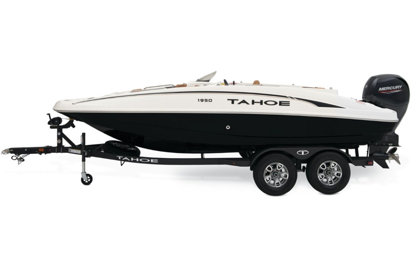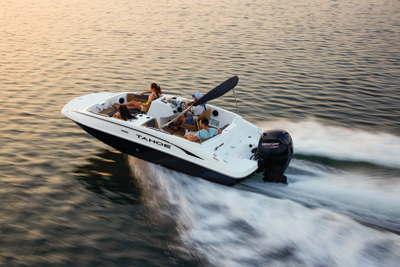 The 2026 TAHOE® 1950 comes standard with a 150hp Mercury® XL FourStroke outboard motor and has a recommended maximum 175hp rating.