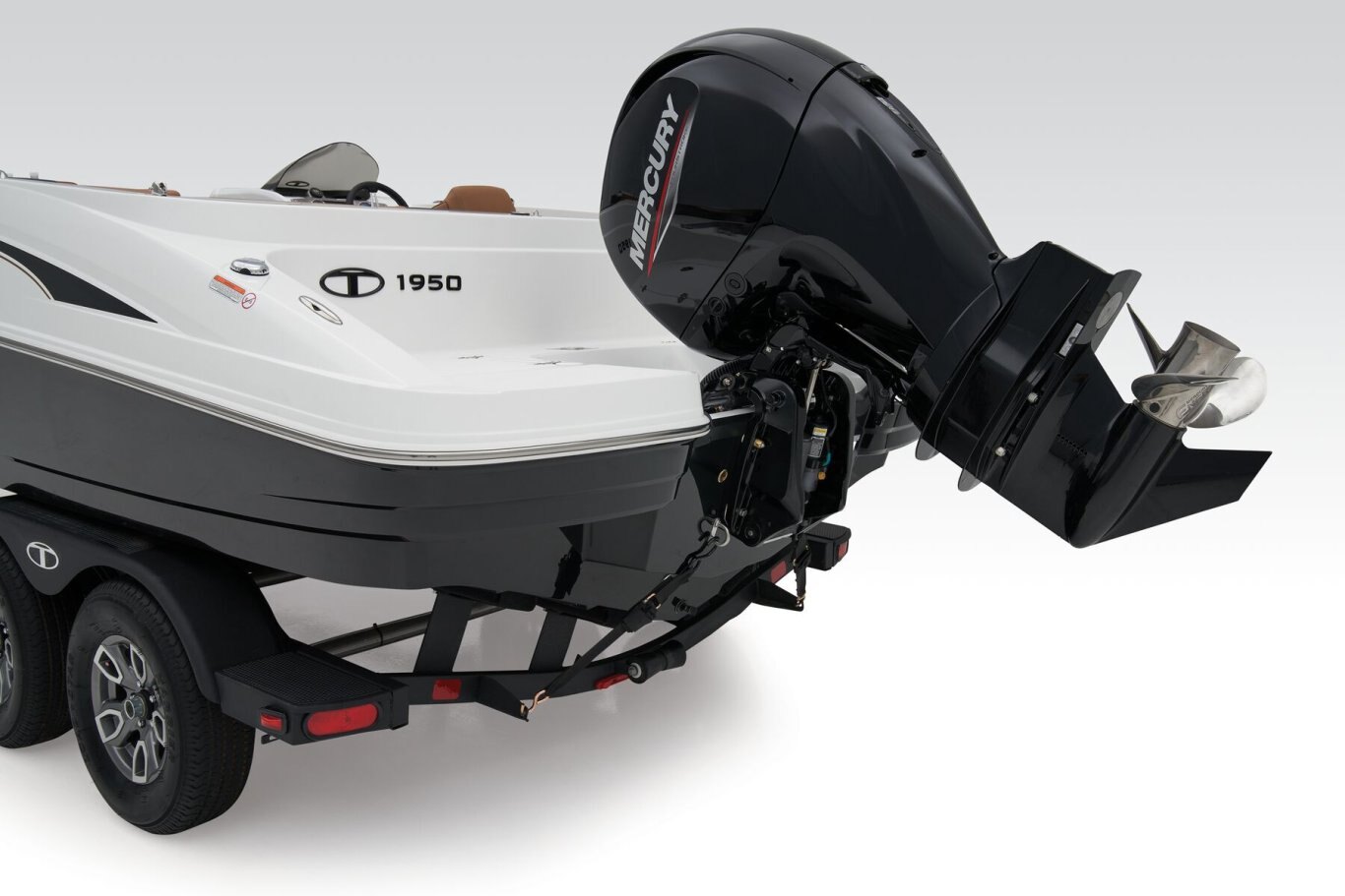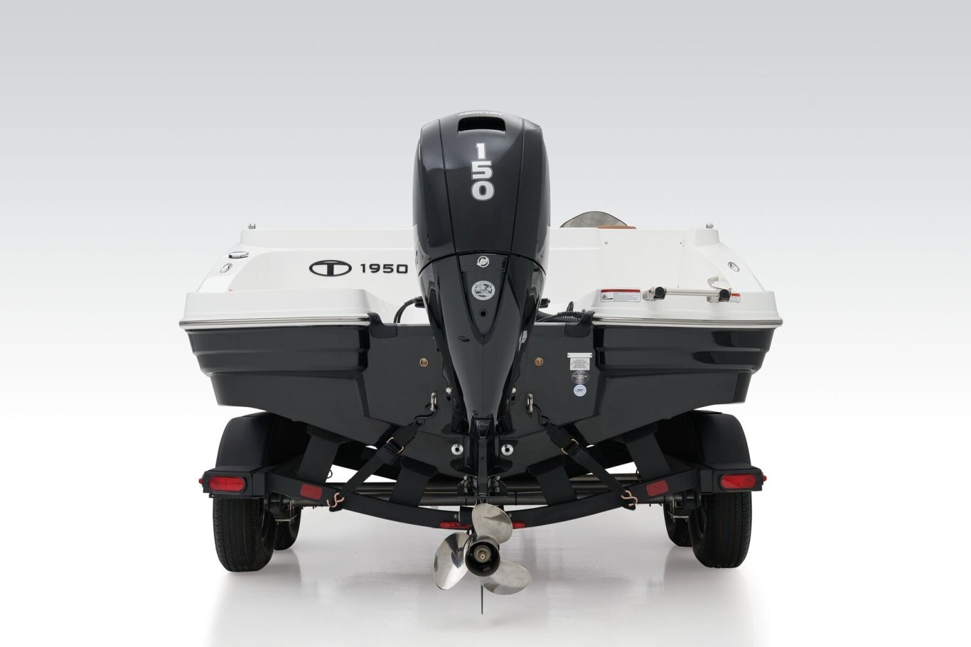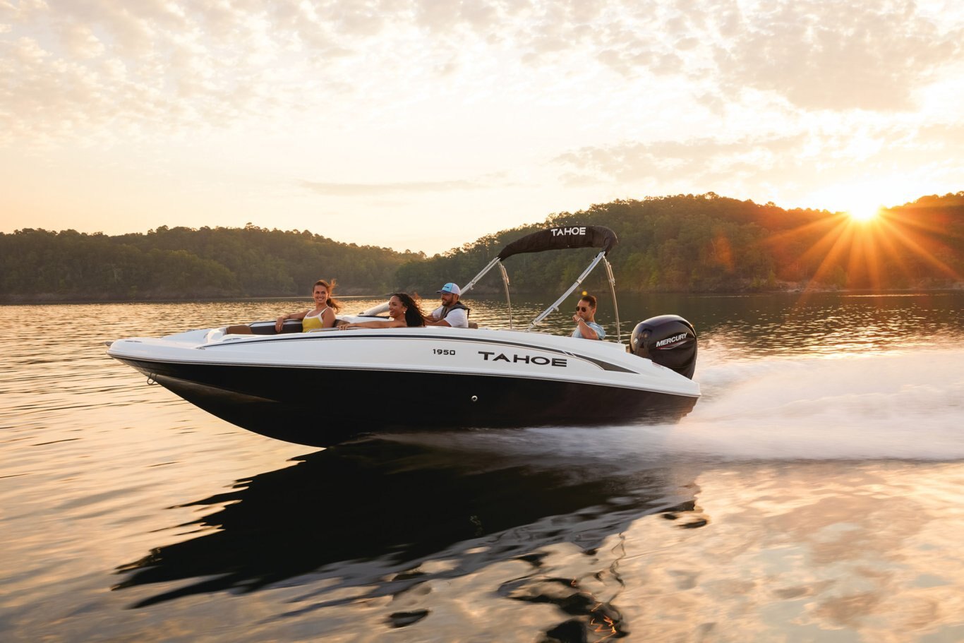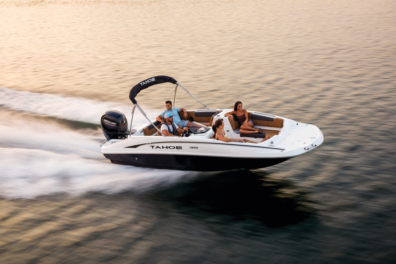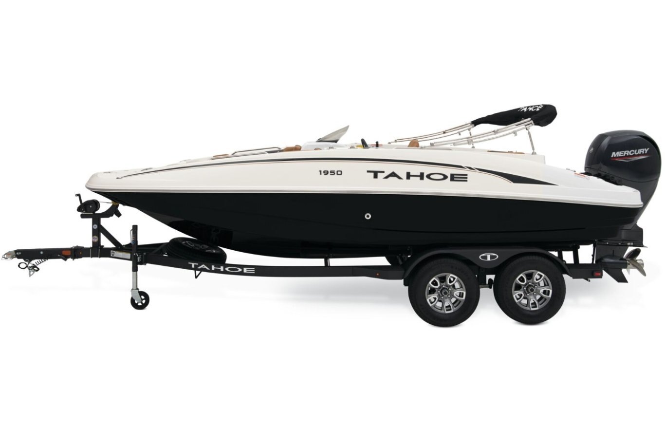 The 2026 TAHOE® 1950 comes standard with a 150hp Mercury® XL FourStroke outboard motor and has a recommended maximum 175hp rating.