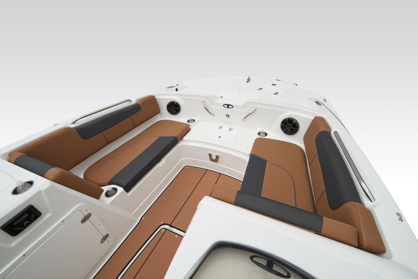 The ample lounges and benches hold a crew of 10. Stow gear, supplies, and more in the hidden storage compartments under the seats and elsewhere. Keep the drinks and snacks cold in the removable 25-qt. cooler. A standard bimini top helps you cool off when the sun is high. This model's removable aluminum ski-tow pylon and in-floor wakeboard/ski storage makes preparing for watersports a snap.