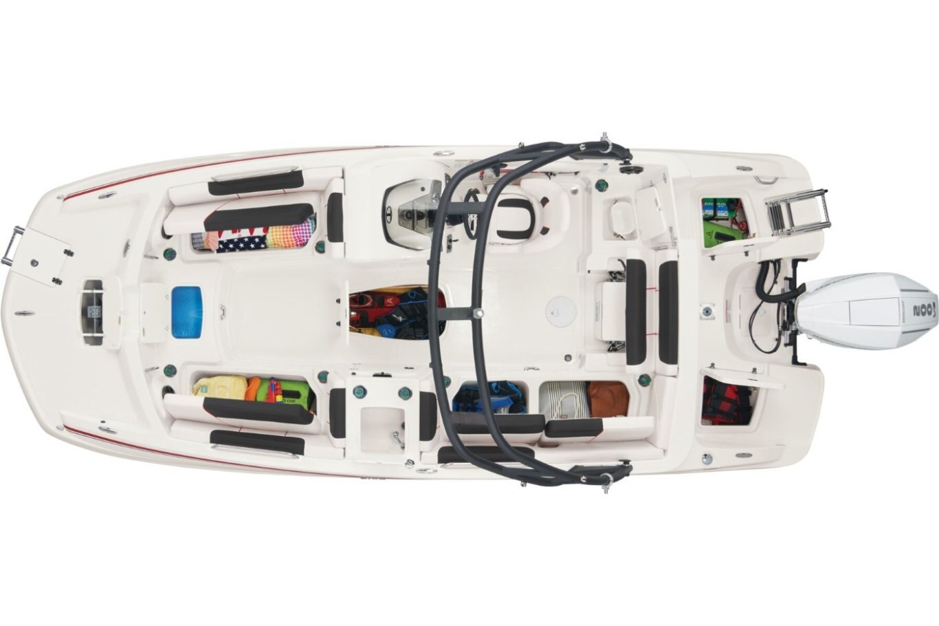 For the fishers, there's the 15-gal. aerated livewell with a pull-out sprayer and rod holders. An available fishing package adds a trolling motor, fish finder, and dual fishing seats. Thrill-seekers will love the in-floor wakeboard and ski storage compartment, standard removable ski-tow pylon, and 4-speaker Kicker® stereo with Bluetooth® compatibility. Pull up the bimini top and relax while the kids jump off the swim platform and get back on the