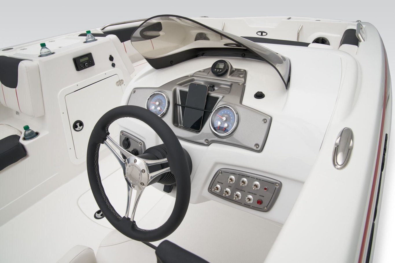 boat using the aft or bow boarding ladders. The helm features traditional gauges and waterproof switches around a sport steering wheel.